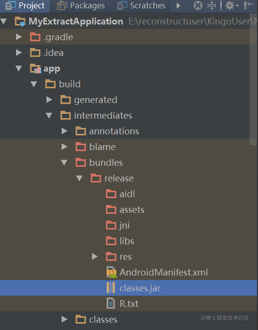 在module下的intermediates文件夹,也生成了一个bundles文件夹,.jar文件也可以用这里生成的,这个就是生成的jar包,现在是不是很明白了;