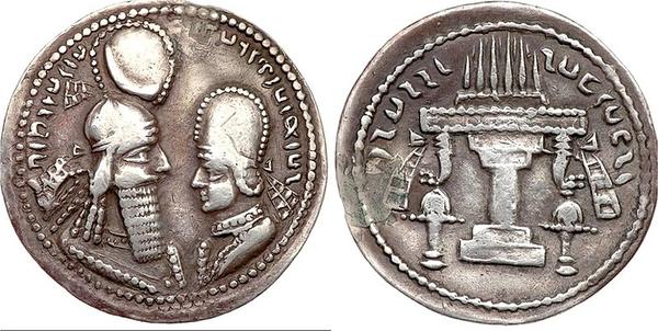 国王与王后头戴的冠冕都是战神巴赫拉姆(古波斯语Verethragna)的象征,或许表明了统治者的神祗信仰。而献上花环的第三人则身份未明。假如将早期阿尔达希尔一世钱币国王与太子同时出现于正面的图案视作惯例的话,则有可能是太子肖像。