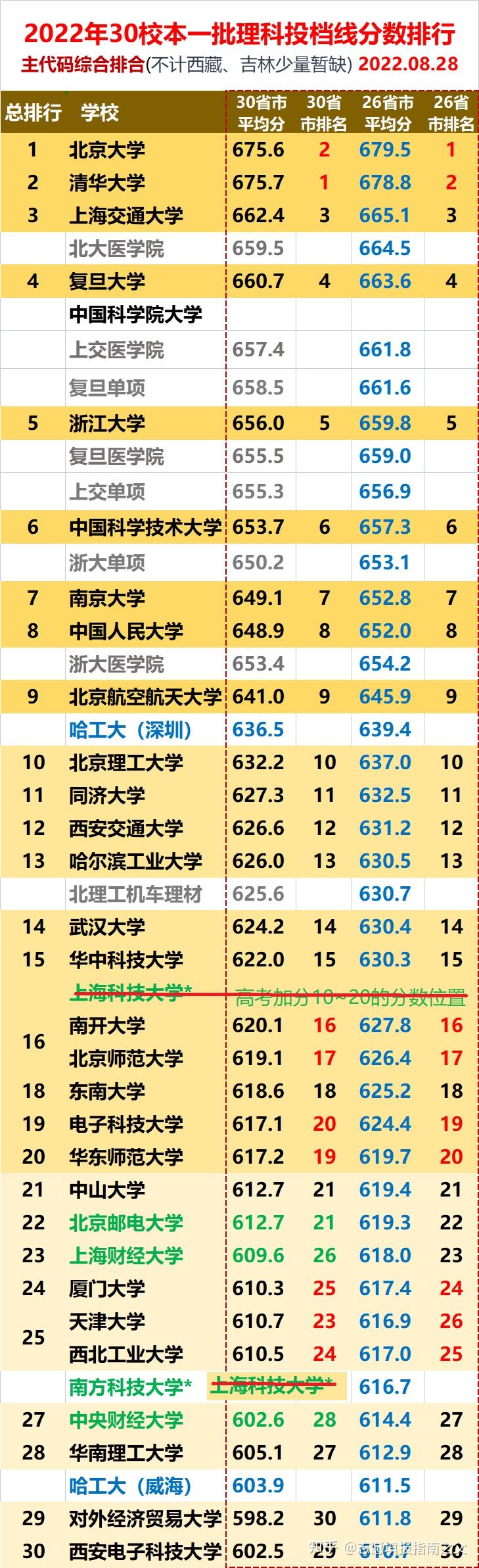 笔者统计了已公布提档线的前30部分院校的数据,这里的提档线仅包含本一批次各校主代码的提档线,不包含医学、中外合作办学、护理等明确单独代码招生的提档线。