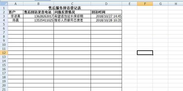 某公司售后服务部有一张售后服务回访登记表,需要每回访完一客户后,就在下表登记填入相关信息,且要记录回访时间。能否稍微减轻点录入信息的工作量呢?