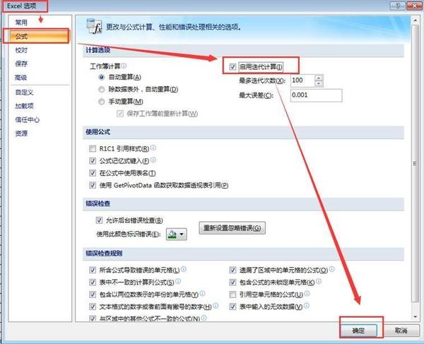在“文件”选项卡下打开“选项”,在“公式”选项卡内勾选“启用迭代计算”,其他默认,然后点击“确定”。为何启用迭代?因为我们后面的公式采用了循环引用,只有启用迭代才能正常运行。