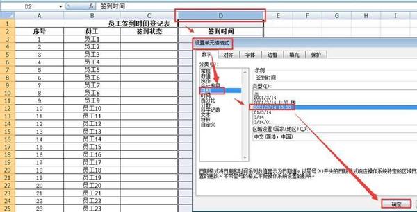 (3)修改时间格式。因D列是常规格式,此步需要将D列修改为精确的时间格式。选中D列数据区域,在单元格格式中设置数据类型为日期,类型为“2001/3/14 13:30”。