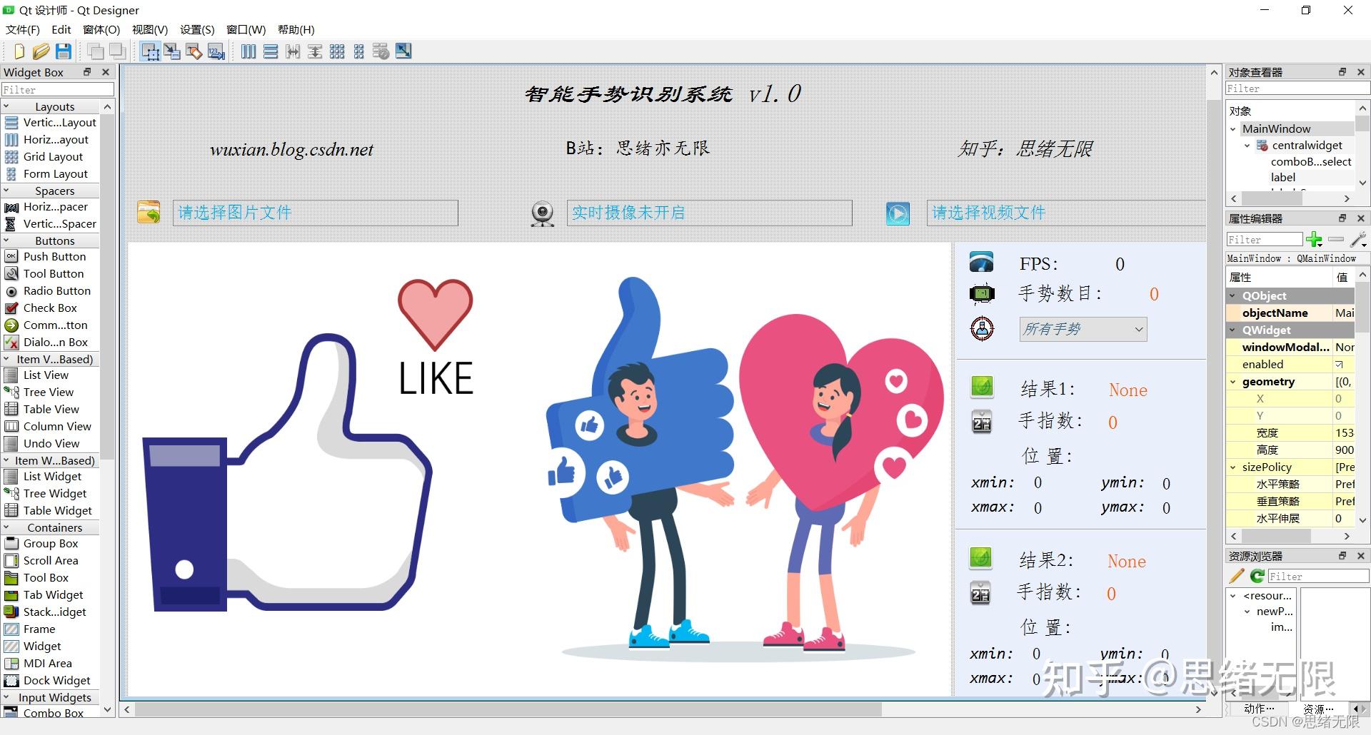 打开QtDesigner软件,拖动以下控件至主窗口中,调整界面样式和控件放置,性别识别系统的界面设计如下图所示: