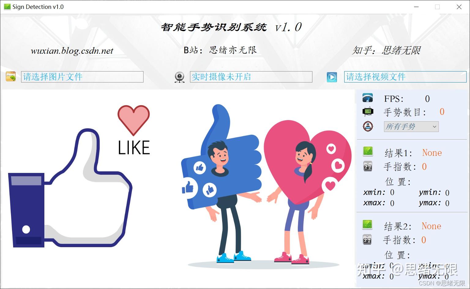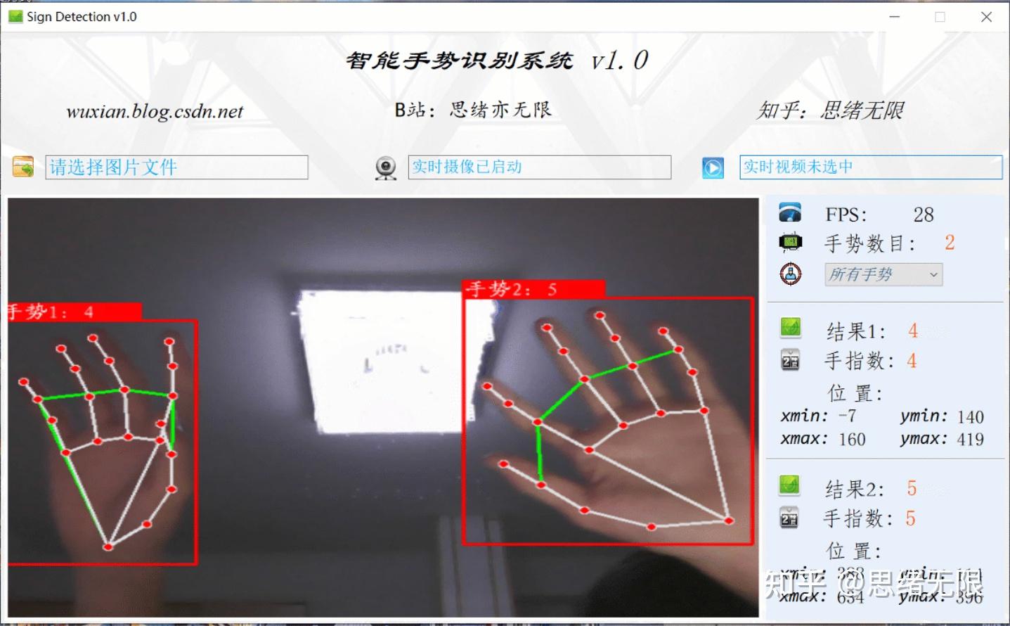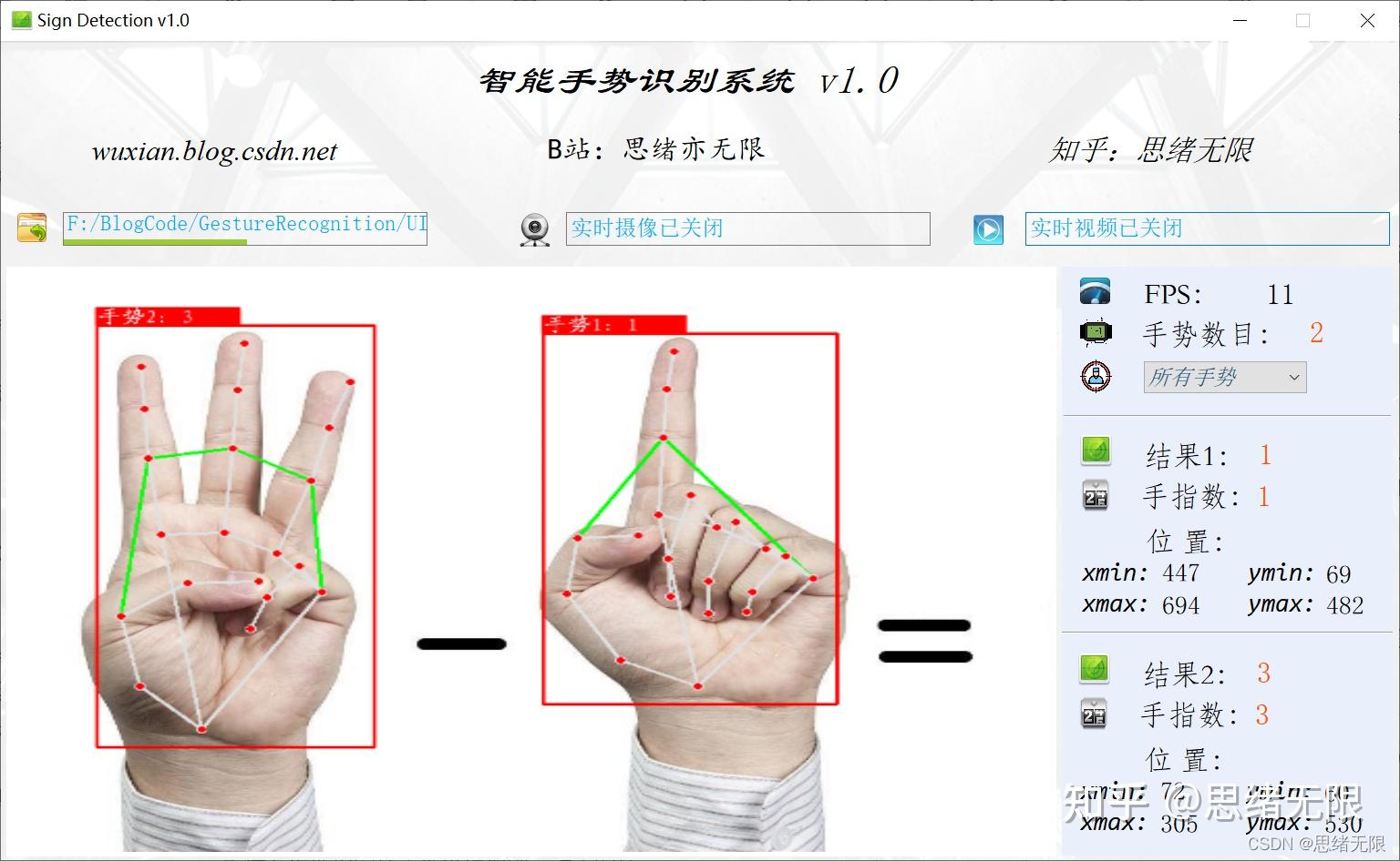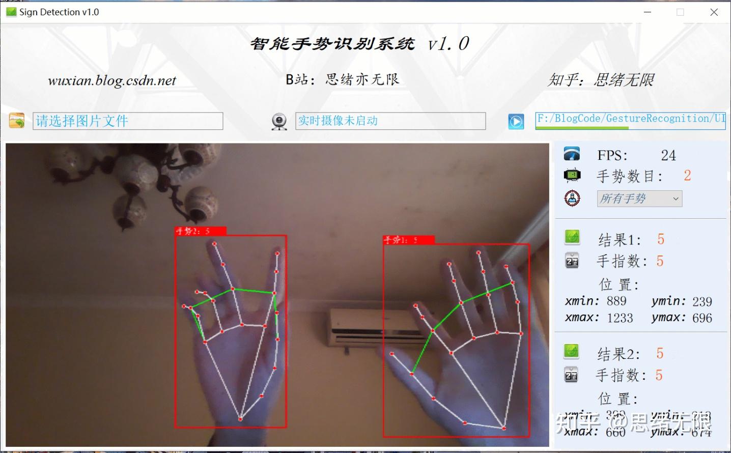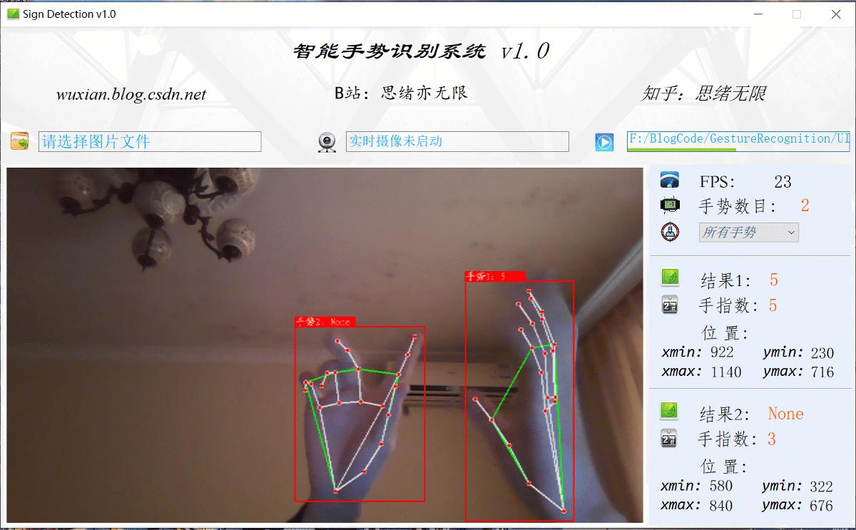 检测手势时的界面截图(点击图片可放大)如下图,可识别画面中存在的多个手势,也可开启摄像头或视频检测: