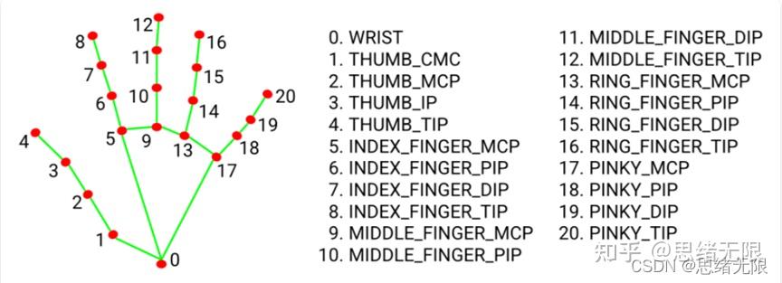 MediaPipe通过对整个图像进行手掌检测后,使用手部关键点模型通过回归对被检测手部区域内的21个三维手部关节坐标进行精确的关键点定位,即直接进行坐标预测。标记点如图所示: