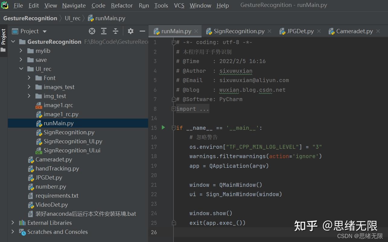 以下就是手势识别的主程序,也就是主要核心内容。通过mediapipe的api我们可以分析出检测到的是左手还是右手,并获取相应手的21个关键点坐标。