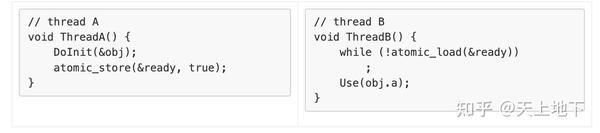 但这种方案有一个问题, 不同的硬件平台具有不同的内存模型. 也就是在 thread B 看到 ready=true 时, 并不意味着 obj 已经完成了初始化, 或者说并不意味着 DoInit(&obj) 对 obj 的更改对 thread B 可见. 完全可能出现一种情况, thread A DoInit(&obj) 对 obj 所做的所有改动仍缓存在 thread A 所在 CPU0 store buffer 中, 对运行在 CPU3 上的 thread B 完全不可见. 这点背景知识可参考 我们都应该了解的 memory barrier 以及背后细节 . 大佬们需要在 atomic_store, atomic_read 之外根据硬件平台各自的要求加入额外的 fetch/barrier 操作使得如上模型正确性成立. 很显然这是个很大成本的操作, 需要对各个硬件平台的内存模型有着精确的了解. 最近随着国产化的流行, 大量的代码从 x86-64 平台迁移到 arm, 我们也遇到过不少由于不了解 arm 平台内存模型, 未正确加入相应 fence/barrier 指令而导致的各种各样的坑. 这么坑往往与高并发有关, 而且很难复现与排查!