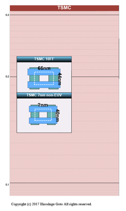 而根据後藤弘茂的分析,台积电7nm DUV的特征尺寸介于台积电10nm FinFET和三星7nm EUV之间,Metal Pitch特征尺寸40nm,Gate Pitch特征尺寸尚不明确,但必定小于10nm时的66nm。