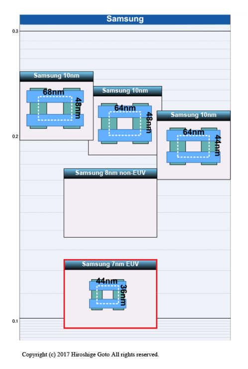 据日本PC WATCH网站上後藤弘茂的分析,三星7nm EUV的特征尺寸为44nm*36nm(Gate Pitch*Metal Pitch),仅为10nm DUV工艺的一半左右。