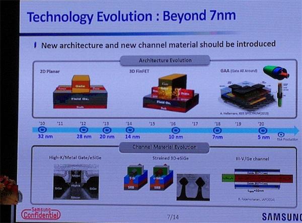 根据三星在CSTIC大会的报告,GAAFET(Gate All Around)是7nm制程节点上最好的选择。GAAFET是一个周边环绕着gate的FinFET,和目前垂直使用fin的FinFET不同,GAAFET的fin设计在旁边,能够提供比普通FinFET更好的电路特性。