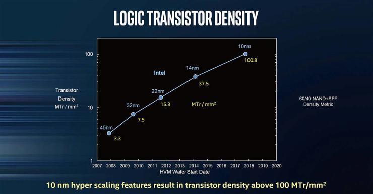 根据Intel公布的晶体管密度表格,其45nm制程的晶体管密度约为3.3MTr/mm²(百万晶体管每平方毫米),32nm为7.5MTr/mm²,22nm为15.3MTr/mm²,上升倍数大约为2.1倍。但是14nm时晶体管密度大幅提升了2.5倍,为37.5MTr/mm²,10nm更是比14nm提升了2.7倍之多,达到100.8MTr/mm²。