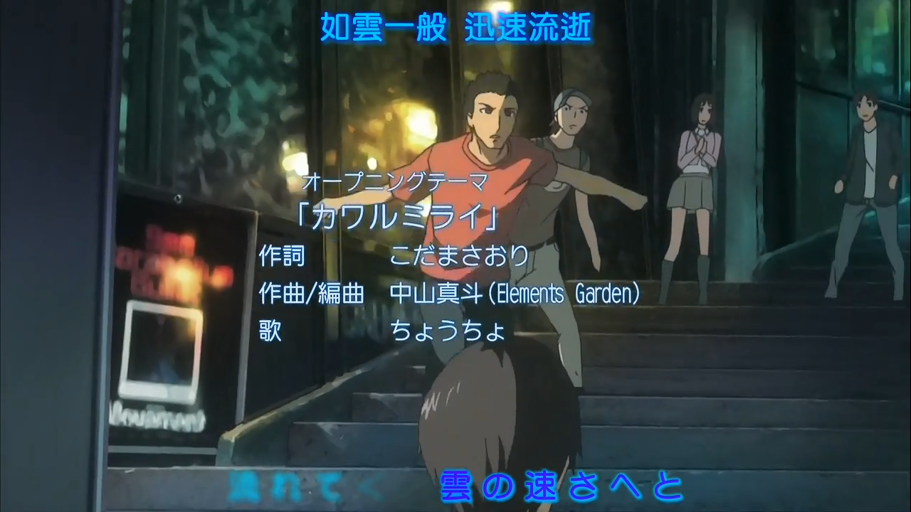 这OP动画完美无缺?当然不是。即便是米兰这种被其亮点冲昏了头脑的家伙,也能看出该动画转场时基本不衔接。可以说明显的过渡只有“男主从电车中向外看,然后表现出惊讶”一处,那之后不久转到三人乘车的镜头也转换得不自然。然而,缺少神衔接MAD一般的过渡并没有影响该动画的观感。毕竟是大厂作品,就算硬切也不会让你难受(背景色调一致)。