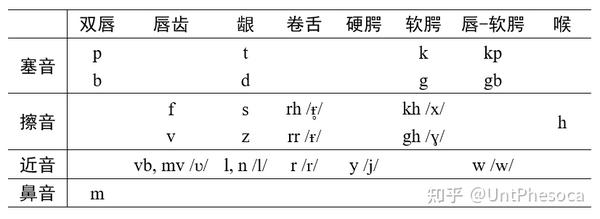 | 塞音 | 擦音 | 近音 | 鼻音 | |