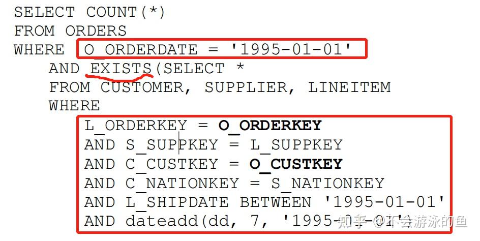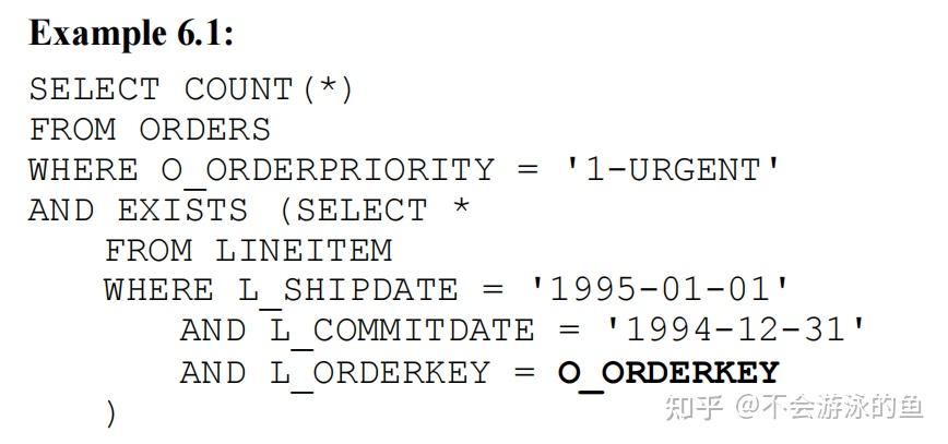 - 无效原因 : 这种常规方式对semijoin无效 。如果在LINEITEM表中,同一订单(L_ORDERKEY相同)有2个items在1994年12月31日提交订单,在1995年1月1日发货。这是,需要对ORDERS表扫描2次,如果L_ORDERKEY与O_ORDERKEY相同,则对于这个L_ORDERKEY来说,ORDERS表的COUNT(*)返回为2,但真实结果应该为1.