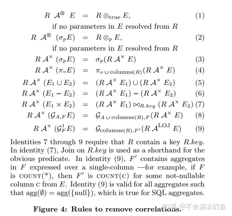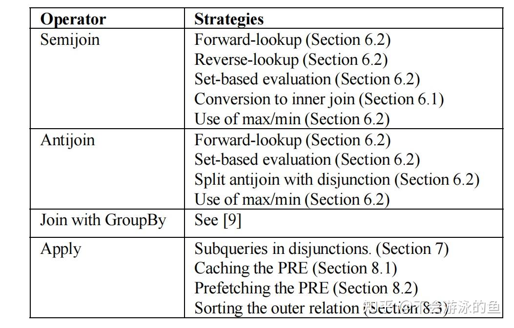- 文献9中提出了去除相关子查询的8个rule,本文是在这个基础上,对Apply算子向semijoin/antijoin的转换的进一步延展,并增加了Apply算子在实现层的优化
