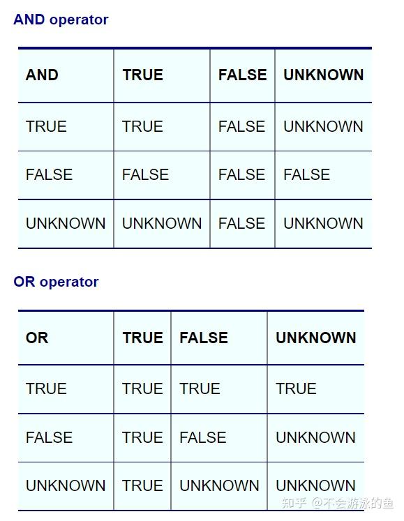 Three-valued logic中IS运算符的结果为TRUE或FALSE,其余运算符还包括了NULL,规则如下: