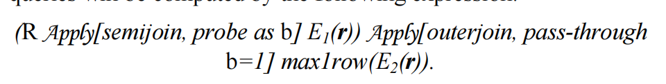- Apply with probe以关系R的行r作为参数,并添加一个新列b,当E1(r)非空时,b为1