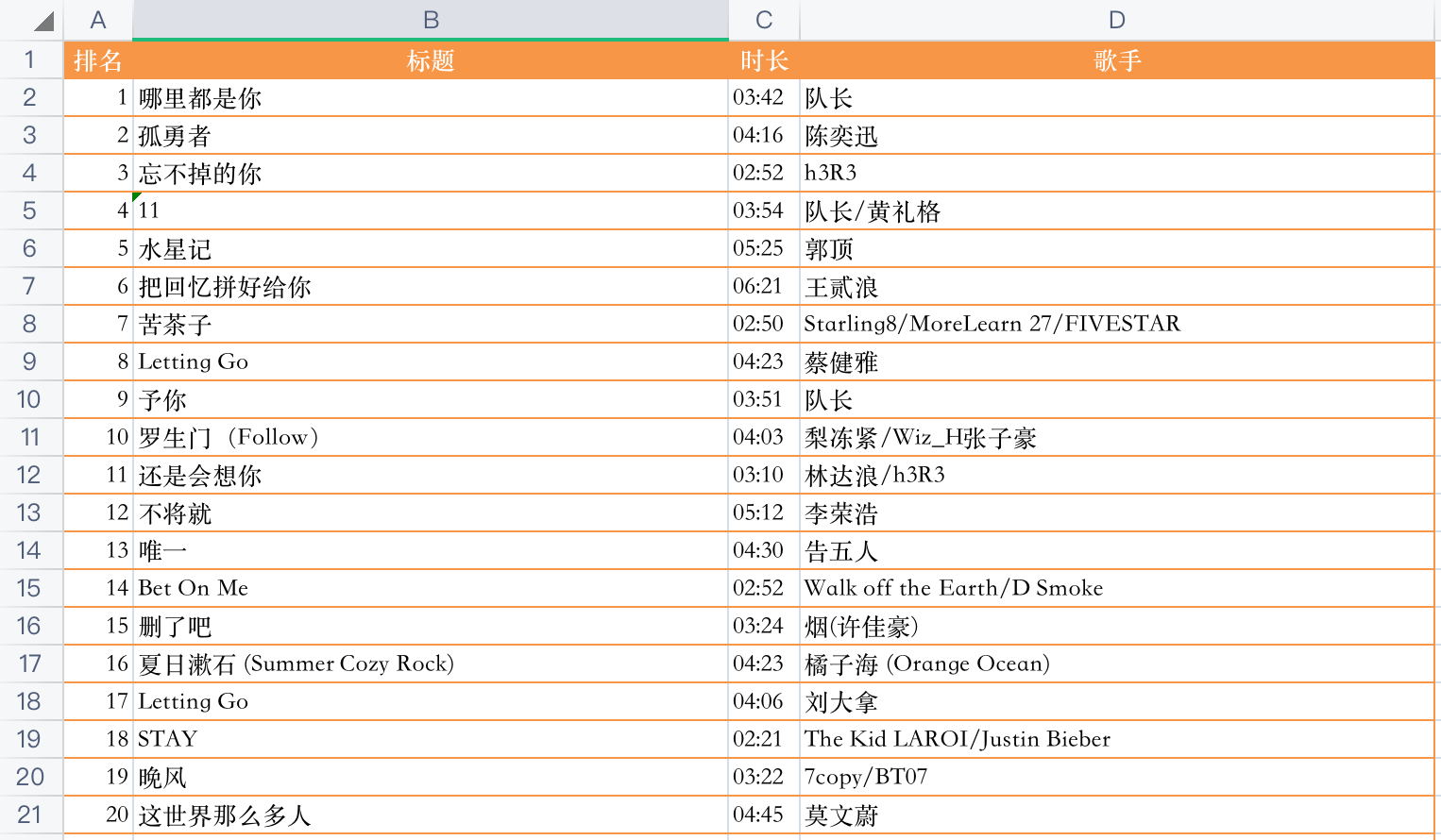 看下结果,以热歌榜前20名为例: