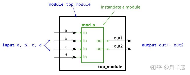 这道题有人拿到手说跟上一题一样,本质是一样的,但是本题必须写成这种按模块端口名称的连接方式,因为这种方式可以不按顺序来连接,所以题目给出的out1, out2, a, b, c, d不是mod_a正确的顺序,可以尝试一下,本题如果按上题来解答,写成下面的形式的话会报错的。