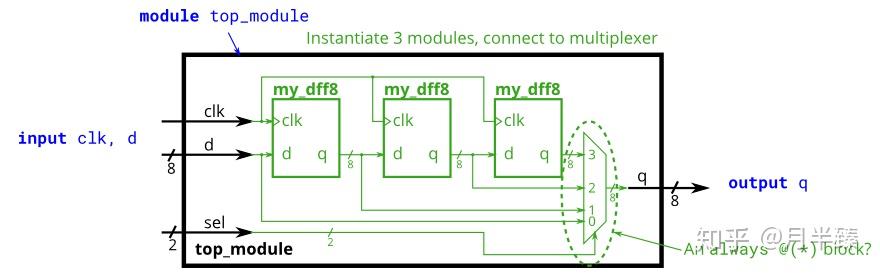 给出了一个名为my_dff8的模块,包含两个输入和一个输出(实现一个8bit的D触发器)。请实例化三个,并将它们连接在一起,形成一个长度为3的8bit移位寄存器。此外,再写出一个4选1多路复用器(未提供模块模型),根据输入的sel[1:0]选择要输出的内容:输入D的值,在第一个D触发器之后的值,第二个或第三个D触发器之后的值。(可以说sel选择的是输入延迟的的周期数,0~3个时钟周期不等。)