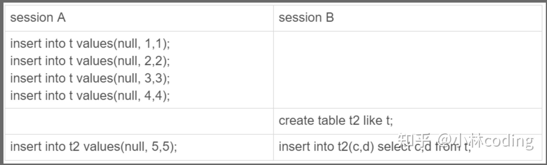 session A 往表 t 中插入了 4 行数据,然后创建了一个相同结构的表 t2,然后 两个 session 同时执行向表 t2 中插入数据 。