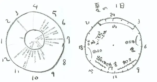 一年四季的农忙时间表(左图)。夏天某日的安排表(右图)。图片来源|農と都市近郊の田園暮らし