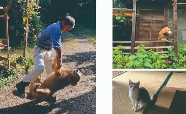 后藤先生和他的金毛犬小梅在玩摔跤(左图)。图片来源|阿希Yui