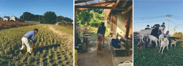 后藤先生把收集起来的马粪进行小麦施肥(左图)。与吉祥物山羊们的合照(右图)。图片来源|阿希Yui