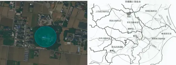 村舍占地的谷歌卫星图像(左图)。羽生市和东京首都圈的位置关系(右图)。图片来源|農と都市近郊の田園暮らし