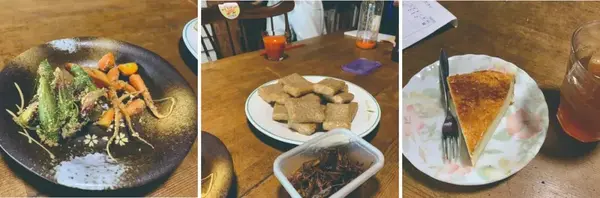秋葵花和胡萝卜的米糠腌渍(左图)。烤过后巨好吃的糙米饼和后藤家自制烤蚂蚱(小编吓得不敢吃)(中图)。后藤太太用山羊奶做的超美味的芝士蛋糕(右图)。图片来源|阿希Yui