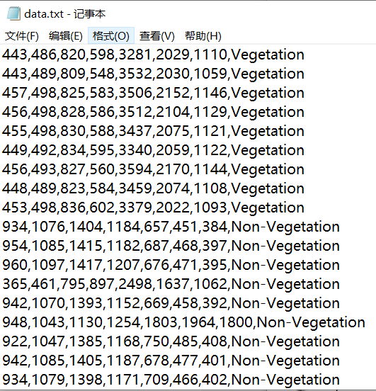 样本数据集为txt,格式如图3所示。每行的前7个数为landset的7个波段值,Vegetation和Non-Vegetation表示该数据为植被还是非植被。具体制作过程直接上代码,注释很详细。