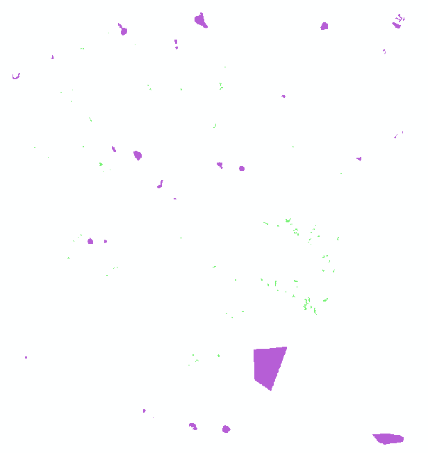 图1是landset的真彩色图像,图2是数字化样本并转成栅格的标签图像,标签图为单波段灰度图,为了更好地展示,我进行了RGB渲染。其中绿色的为植被样本,紫色的为非植被样本。