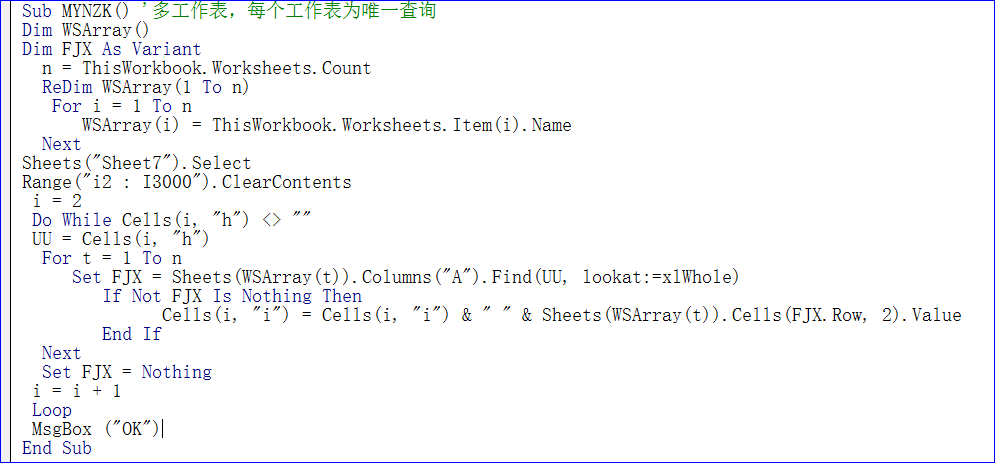 代码的注意点:工作表名称的利用要注意是当前正在查询工作表,被查询的数据位于Sheets("Sheet7")的H列,结果返回到I列。