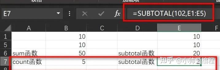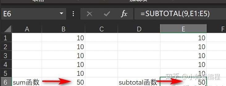 无隐藏数据时求和,sum函数和subtotal函数功能一样,公式:=SUBTOTAL(9,E1:E5)。公式中第一个参数是9,因为1到11(计算隐藏值)
