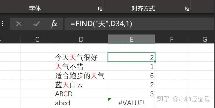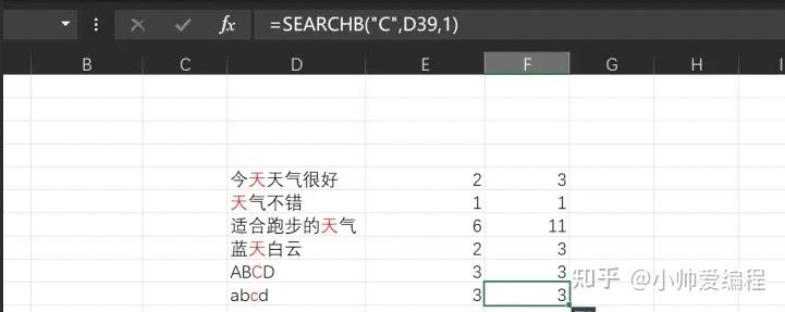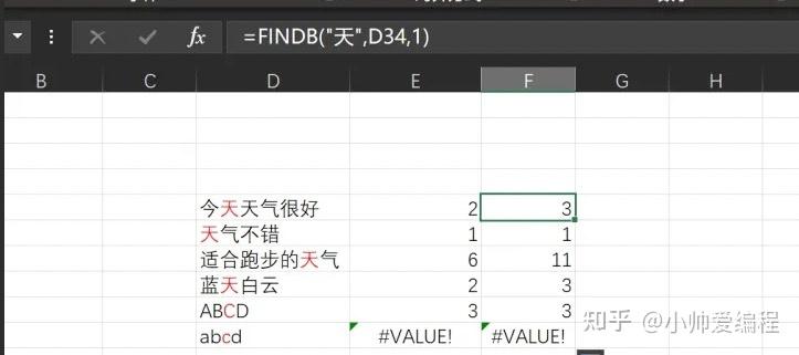查找天在文本中的位置,查找C在文本中的位置,findb区分大小写,所以最后一个会错误