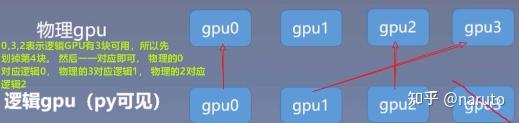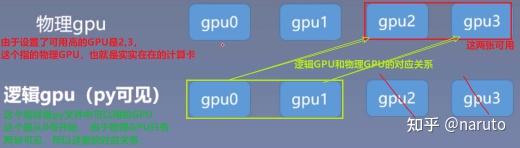推荐的方式是设置系统的环境变量:os.environ.setdefault('CUDA_VISIBLE_DEVICES', '2,3')通过这个方法合理的分配GPU,使得多个人使用的时候不冲突。但是这里要注意一下,这里的2,3指的是物理GPU的2,3.但是在逻辑GPU上,这里表示的0,1.这里看下对应关系: