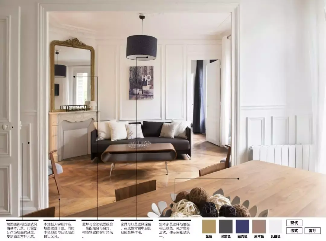 像下面这张分析图,已经有复杂的护墙板和镜子,吊灯、家具都款式则选简约的款式: