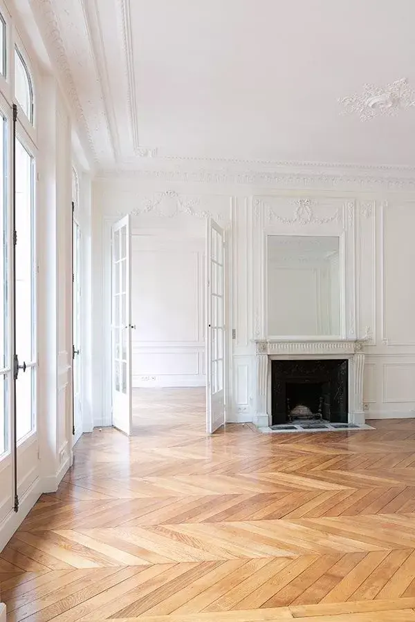 “对称” 就很好理解了,法式讲究均衡,你会发现不论是吕字型的护墙板还是人字形的木地板,都是遵从的对称的原则。