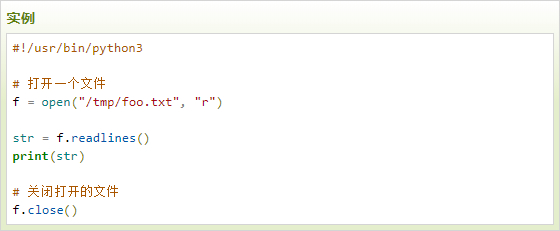 在了解对象方法 f.readline() 和 f.readlines() 区别之前先创建一个称为 f 的文件对象。使用字符串写一个名称为 foo.txt 的文件,文件对象 f 所对应的文件为 foo.txt,看实例: