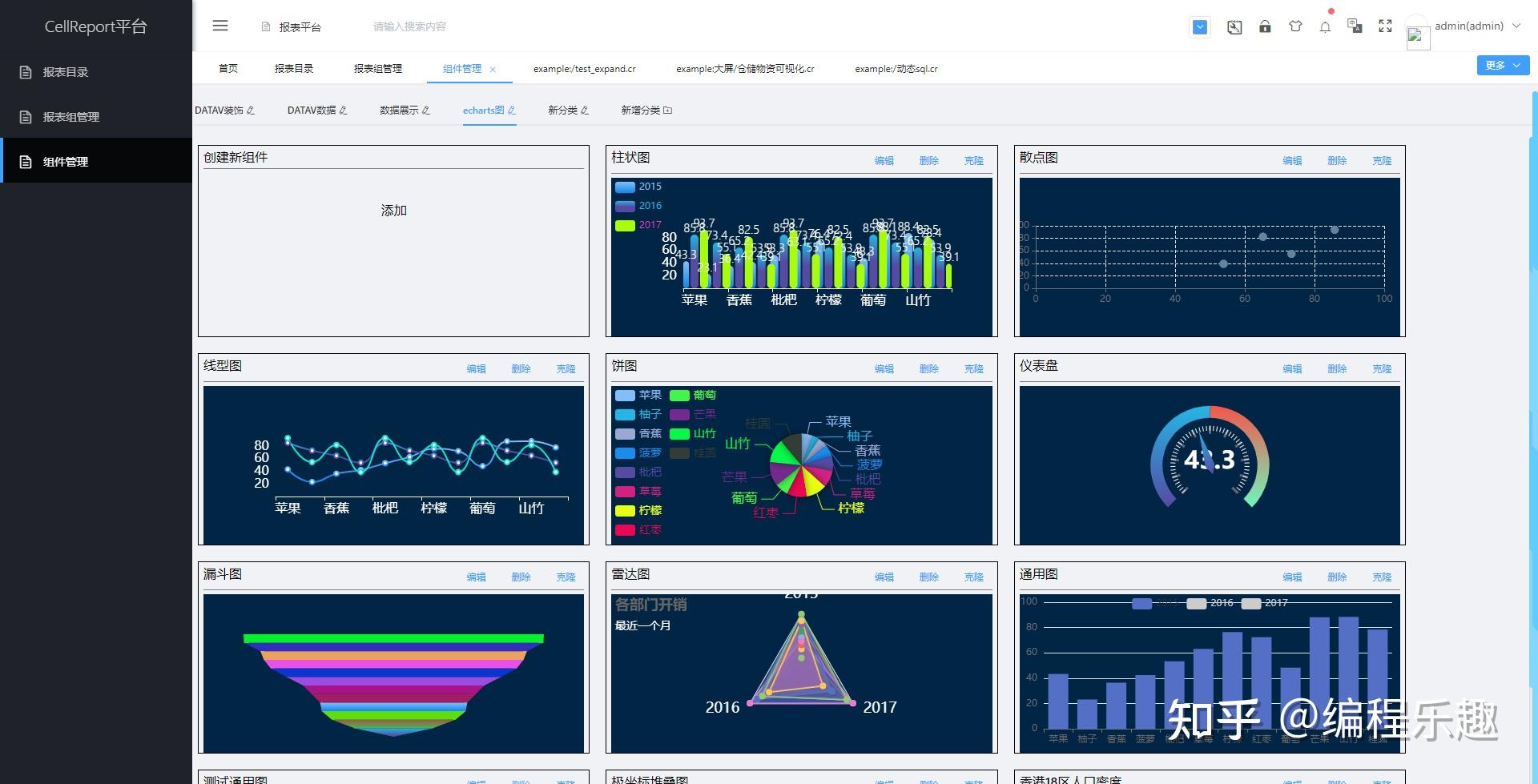 4、内置报表:预定义报表、echart报表、数据展示组件。可通过可视化托拉拽自由组合大屏幕报表。