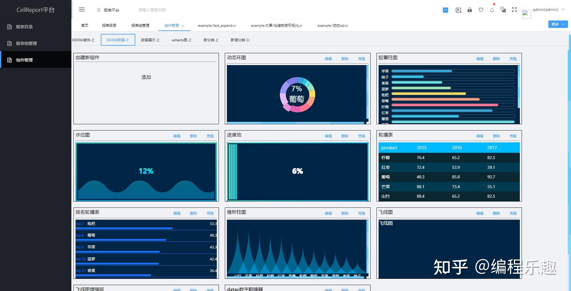 组件管理:动态环图、柱状图、水位图、进度图、轮播表、排名轮播表、数据展示组件、ehcart常用组件、跑马灯等组件。