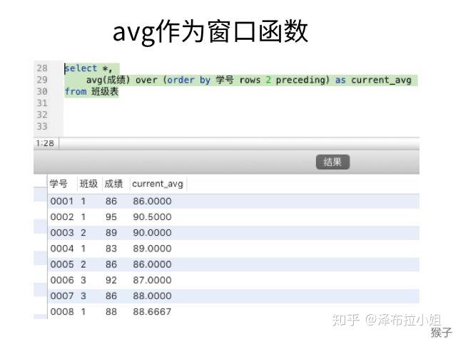 rows 2 preceding,是“之前2行”的意思。也就是得到的结果是自身记录及前2行的平均。