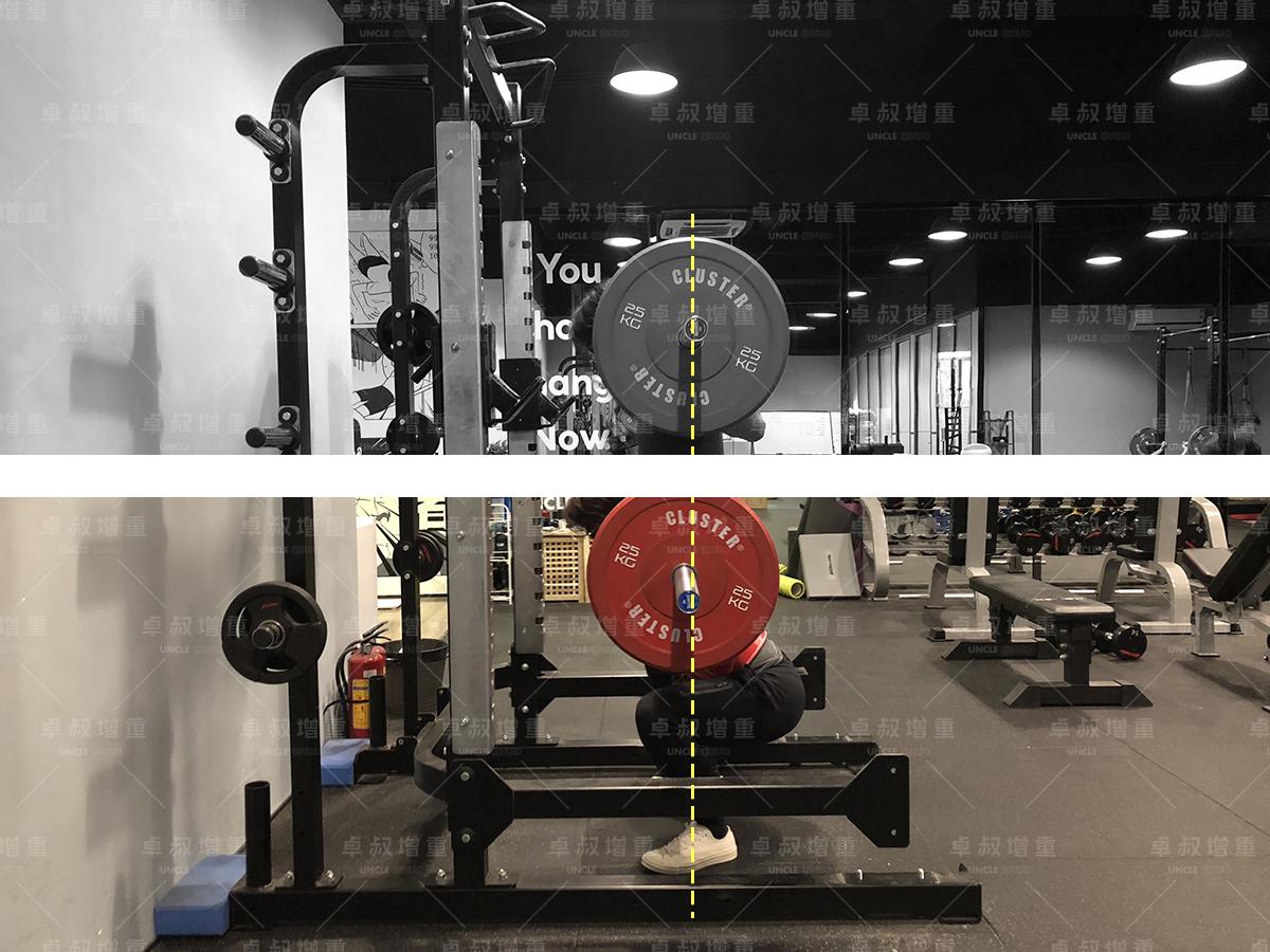 杠铃越重,重心就越接近杠铃本身。如果你负重较大,可以直接认为杠铃杆就是重心所在。