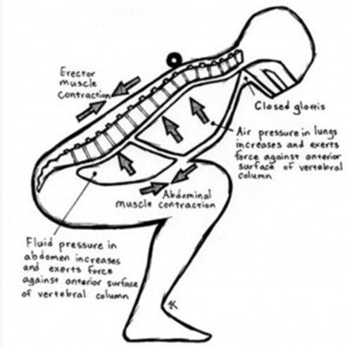 瓦氏呼吸是通过增加腹腔压强,让腰椎周围的空间成为一个不容易变形的刚体,承受大部分的压力,这样腰椎就安全了。