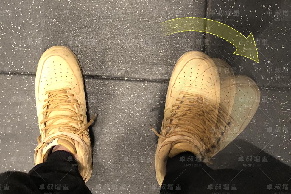 如图,将你的脚尖往外旋转,脚跟往内旋转。但这只是一个夸张的示意,实际上,我们不应该打破鞋子与地面的摩擦力。也就是说,脚实际上是不动的。