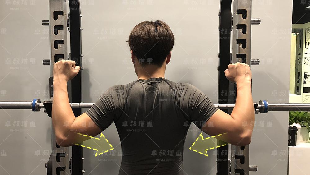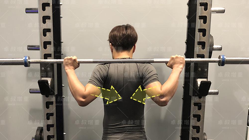 上面握距部分有提到要配合夹紧背部。夹紧背部的目的是保持胸椎段稳定,协助背部挺直。