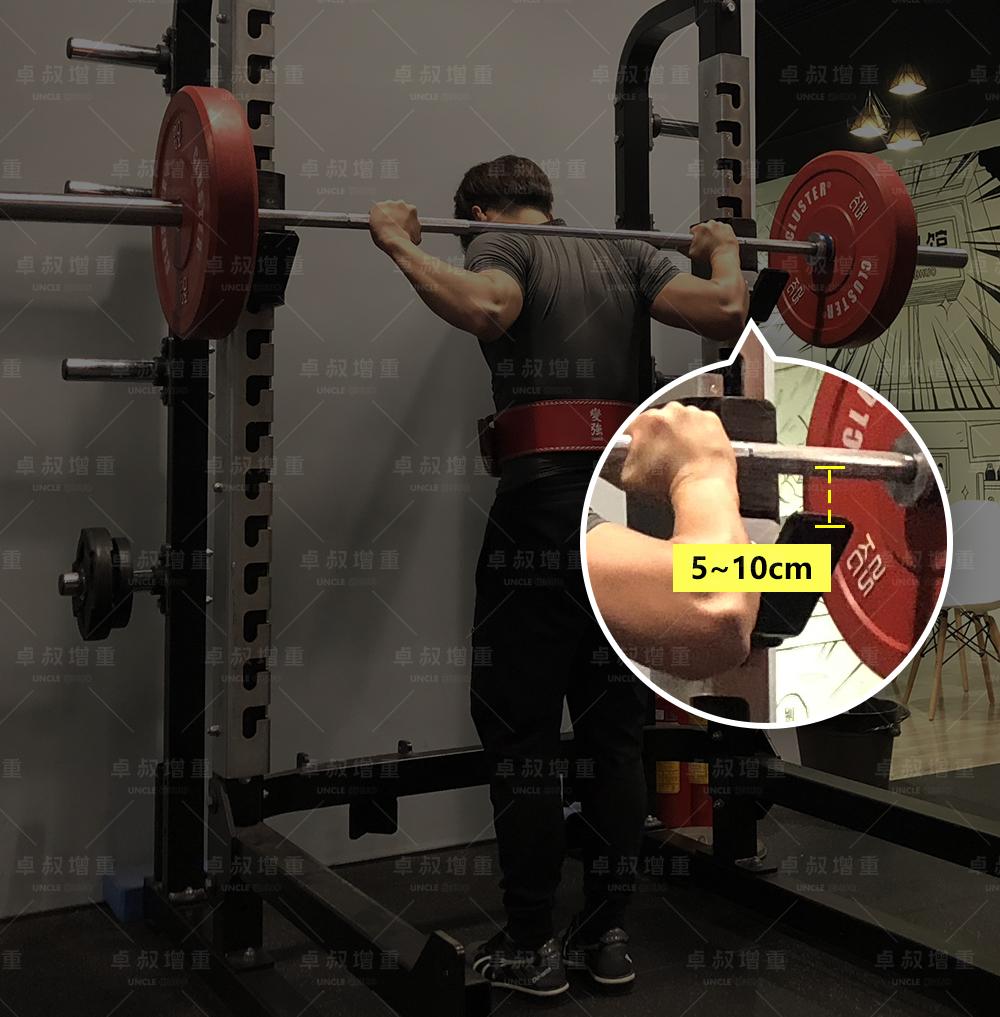 当你扛起杠铃站直,准备出杆时, 杠铃杆最好和挂钩之间,有5~10cm的间距 ,这样出杆回杆才不会碰到挂钩,比较安全。