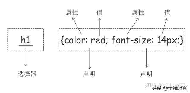 每个CSS样式由两个组成部分:选择器和声明。声明又包括属性和属性值。每个声明之后用分号结束。