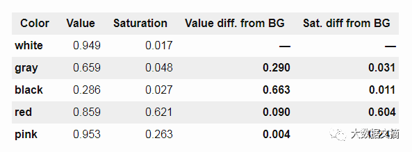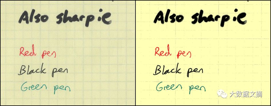 从表中可以看出,笔记反面渗过来的深灰色应该被分为背景色,但它与白色背景的差值要比粉红色的差值更大,而粉红色应该是前景色。如果使用这种方法,就无法有效分离出粉红色的前景色,因为总会包含渗过来的深灰色。