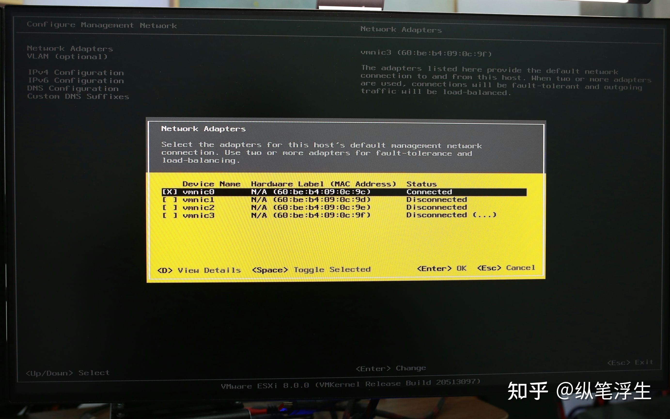 经过插拔网线,四个接口的顺序和ESXi系统显示的网口是一一对应的。选择etho接口作为管理口。通过键盘上下键,移动黑色条框,按空格确定选项。